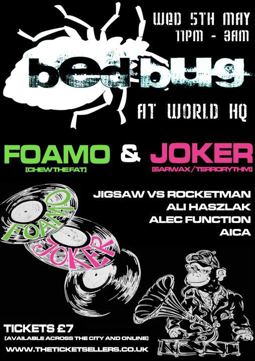 05/05/10: BEDBUG: Joker & Foamo @ World Headquarters ★★ BEDBUG NEWCASTLE LAUNCH NIGHT ★★ Wednesday 5th May 2010 (11.00pm - 3.00am) At World Headquarters - Newcastle Upon Tyne HEADLINING: ★ JOKER ★ (Earwax/ Terrorythm) http://www.myspace.com/thejokerproductions ★ FOAMO ★ (Chew The Fat) http://www.myspace.com/foamo Playing across 2 rooms and supported by: Jigsaw Vs Rocketman (Gatecrasher) Ali Haszlakiewicz (ZAP!) Alec Function (Mudlove) and Aica (Turbulence) ▼▲HUGE DRINKS PROMOTIONS ALL NIGHT▲▼ Facebook Event: http://www.facebook.com/event.php?eid=3 ... 795&ref=ts Advance tickets just £7.00 and available from ticket agents all over the city, Beatdown Records and online now at http://www.skiddle.com/events/11369092/ or call 0844 884 2920 Info: 07967 368 118