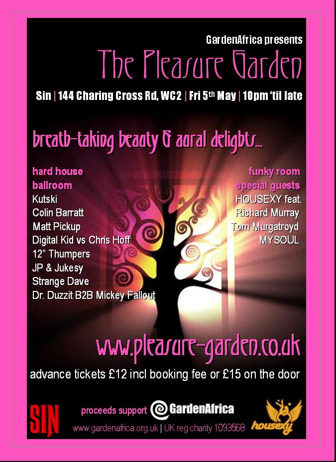5th May - Kutski, JP&Jukesy, 12" Thumpers etc... The Pleasure Gardens - a charity event “A fantastical concoction of light and sound, with all manner of sensory delights and gratifications…” On Friday the 5th May 2006, GardenAfrica creates a brand new club night – a 21st Pleasure Garden – at fashionable London club, Sin from 10pm ‘til 7am. An evening full of breath-taking beauty and aural delights, not to be missed. All proceeds from The Pleasure Garden @ Sin will support GardenAfrica’s development programmes in sub-Saharan Africa. On offer: Hard Dance and the Funkiest of House in an exotic ‘garden’ setting… It is our absolute pleasure to confirm a whole host of DJs who have each so generously offered GardenAfrica their own special kind of service. The Ballroom will treat us all to some of the finest Hard House DJs currently on the circuit: Kutski (Radio 1), Colin Barratt (Tidy), Matt Pickup (Frantic), Digital Kid vs Chris Hoff (Tidy), 12” Thumpers, JP & Jukesy (Deprivation Recordings), Strange Dave (B2T), Dr. Duzzit B2B Mickey Fallout (Extreme Euphoria). See notes below for further information. In the Funky House room, the aural pleasure continues with Housexy DJs Richard Murray, Tom Murgatroyd and MYSOUL. Having begun to establish itself as the name with the hottest cuts likely to cause a stampede to any dance floor, Housexy is currently spreading its quality sounds through residencies in the UK & abroad – and continues to grow with this unique event as a dead cert to get hips swinging and people talking. Advance tickets on sale from Saturday 25th March at £12 each incl booking fee; £15 on the door. For tickets & information, visit www.pleasure-garden.co.uk or call 08702 43 23 46. GardenAfrica (www.gardenafrica.org.uk) is a non-governmental organisation that creates & supports a wide ranging programme of garden-related developments across sub-Saharan Africa aimed at overcoming poverty, disease, and malnutrition – ‘the silent emergency’ that kills millions every year. GardenAfrica’s current campaign, launching at the 2006 Chelsea Flower Show, is to create 1,001 gardens in targeted countries over the next three years. On completion, they can propagate well over 500,000 new gardens within five years. The show-garden at Chelsea will offer a unique opportunity to see for the first time the type of gardens GardenAfrica creates. Pleasure Gardens have existed for centuries and were long regarded as dangerous and disreputable places. Over time they transformed into exotic settings for lavish events and parties, eventually becoming an essential part of London's fashionable night-life… But pleasure gardens never quite lost their racy reputation, which by all accounts, was richly deserved! DJ info: Kutski – Radio 1 Chosen by the BBC as the first DJ ever to hold a Residency soley dedicated to Hard Dance on Radio 1, Kutksi will be scratching and juggling his way through his un-usual and un-predictable but definitely banging set. Colin Barratt – Tidy Both a productions legend and excellent DJ, Colin will be gracing the decks with his unique blend of the hard stuff. Matt Pickup – Frantic This man’s no stranger to London, having taken Frantic by storm with his blend of Filthy Energetic Hard House / Techno. Digital Kid vs Chris Hoff – Tidy With their productions storming to the top of the DJ charts across the country, these lads are certainly no strangers to the scene. 12” Thumpers Needing no introductions, the label is one of the few to have over 100 releases to their name. The boys have been on the circuit now for many years, and it is no surprise their popularity remains as strong as ever. JP & Jukesy – Deprivation Recordings Having established themselves both as quality versatile DJs and pioneering producers on the Hard Dance scene, the lads are closing in on their plans for world domination. Strange Dave – B2T Known throughout clubland for his promotions as well as his prowess behind the decks, the Strange One will be bringing his unique up-front style to the party. Dr. Duzzit B2B Mickey Fallout – Extreme Euphoria These boys are no strangers to the Hard Dance London scene and will be bringing their own special style and NRG to the evening. Richard Murray, Tom Murgatroyd and MYSOUL Spinning cuts from the likes of David Morales, Mish Mash and Haji & Emanuel, the soulful sounds will offer revellers a decadent environment where hip swinging and glamour will go hand in hand. Fast becoming the brand name to drop on the vocal house scene, the Housexy Spring 06 release is already helping to kick away the winter blues with the current UK and International tour blazing up dance floors. Housexy Spring 06 is out now on Ministry of Sound. Join the housewarming: www.housexy.com